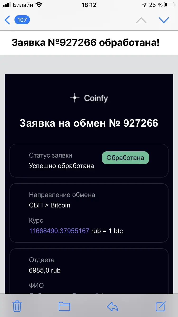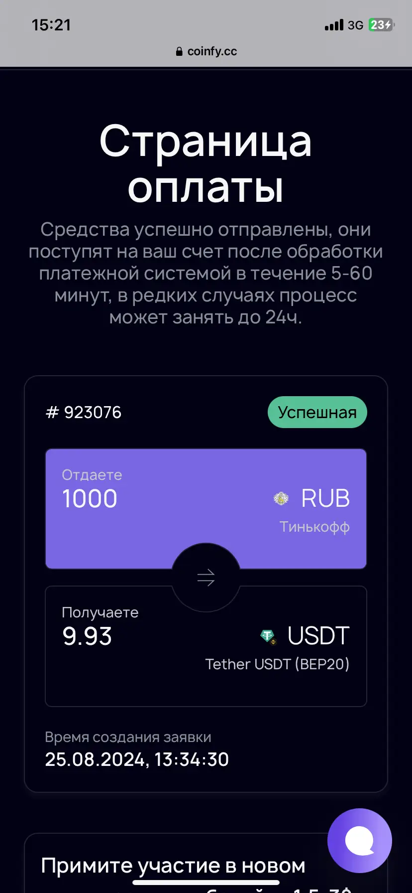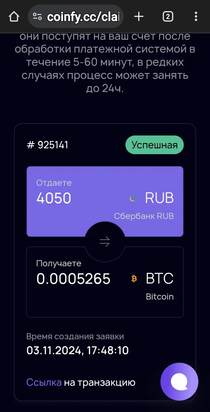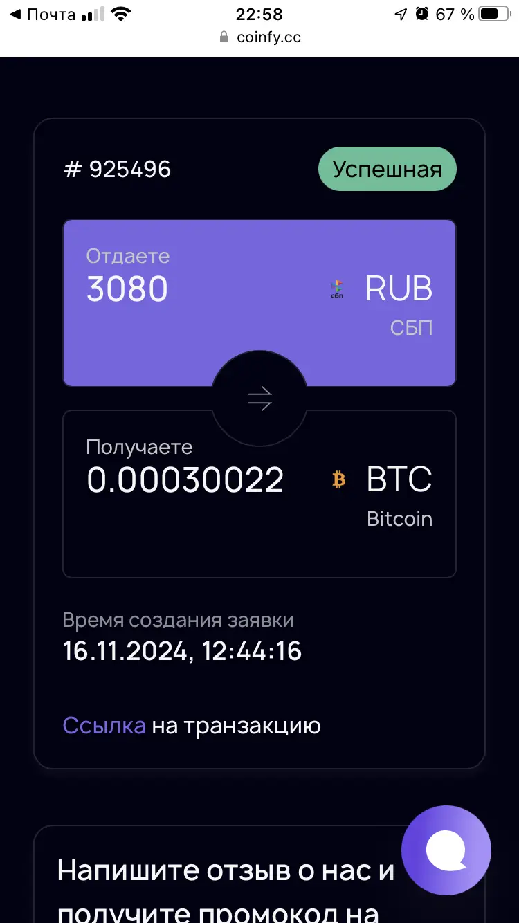 Вы можете оставить свой отзыв, если имеете опыт взаимодействия с обменником Coinfy. Не забудьте похвалить обменник, если обмен прошел успешно. Если у вас есть жалобы на работу coinfy.cc, вы можете в отзывах высказать все свои претензии.