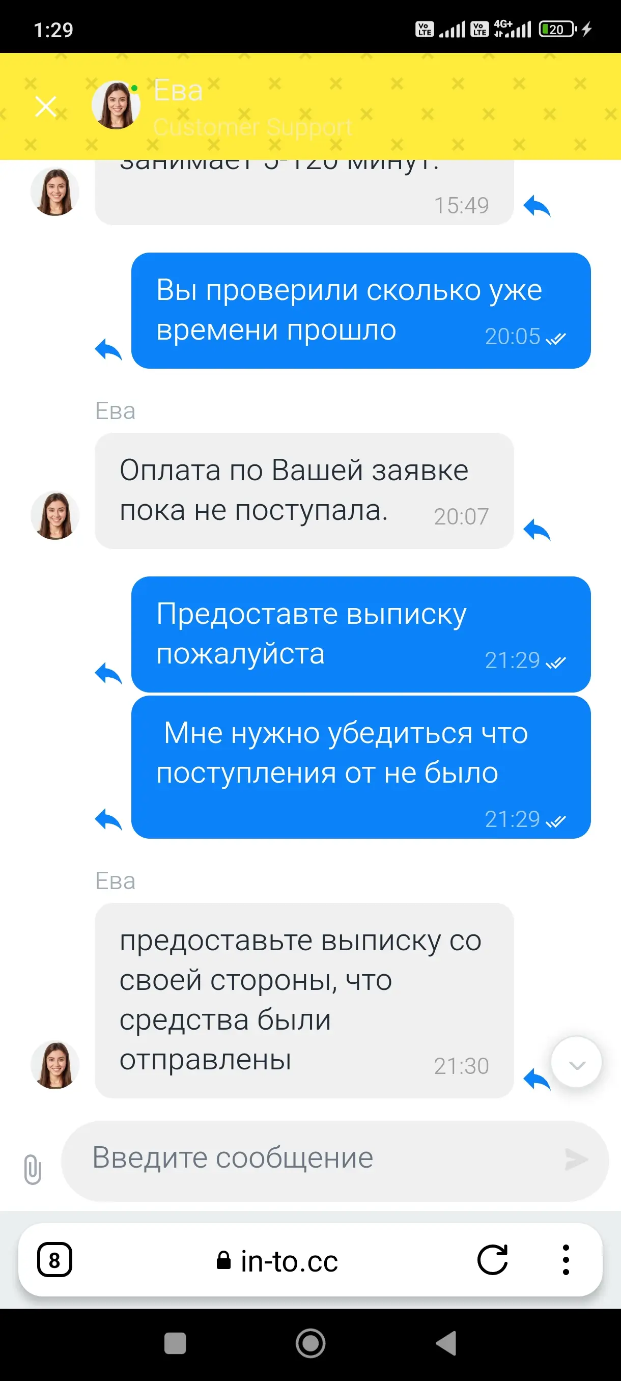 Вы можете оставить свой отзыв, если имеете опыт взаимодействия с обменником In-To.cc. Не забудьте похвалить обменник, если обмен прошел успешно. Если у вас есть жалобы на работу in-to.cc, вы можете в отзывах высказать все свои претензии.