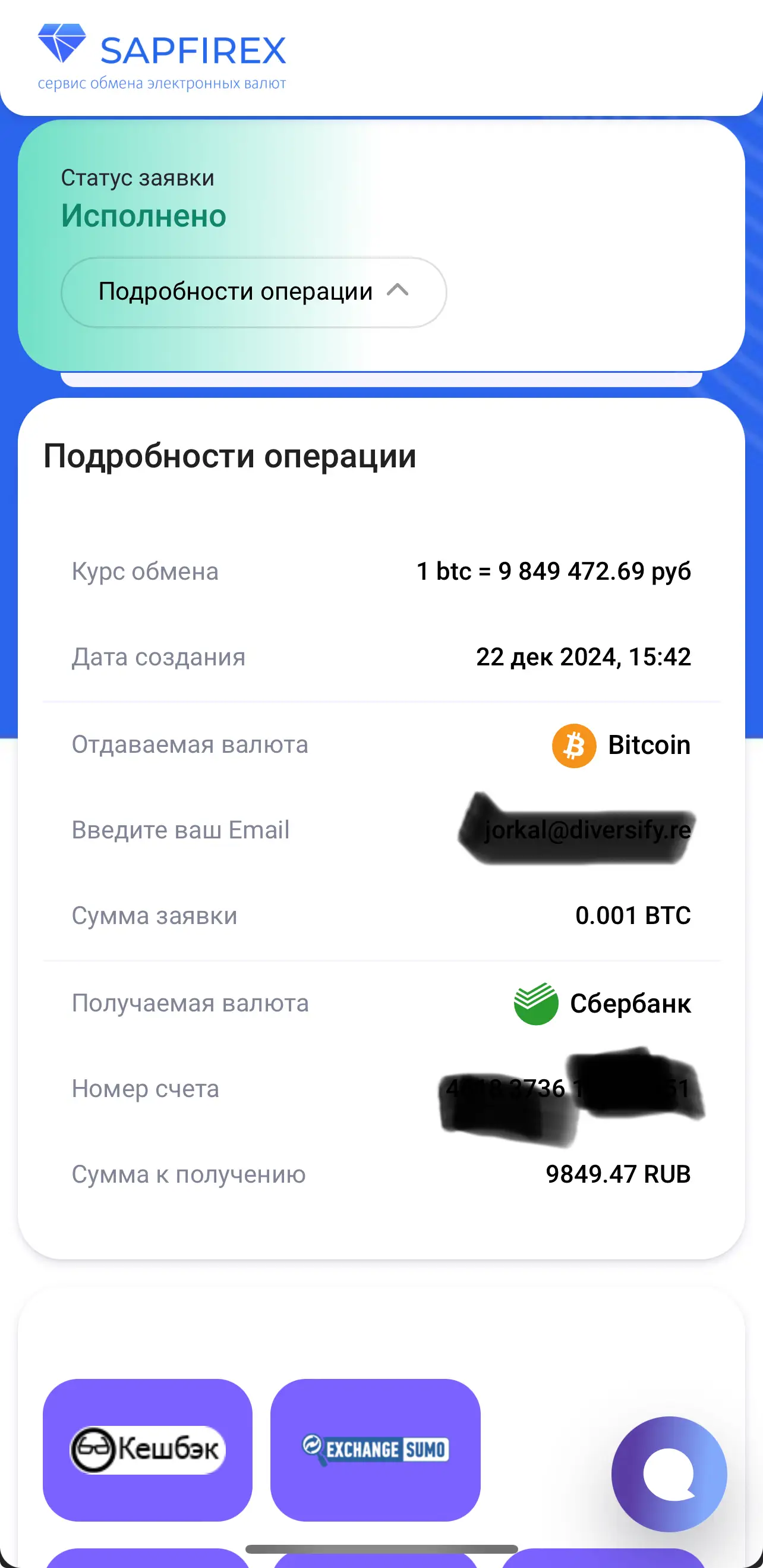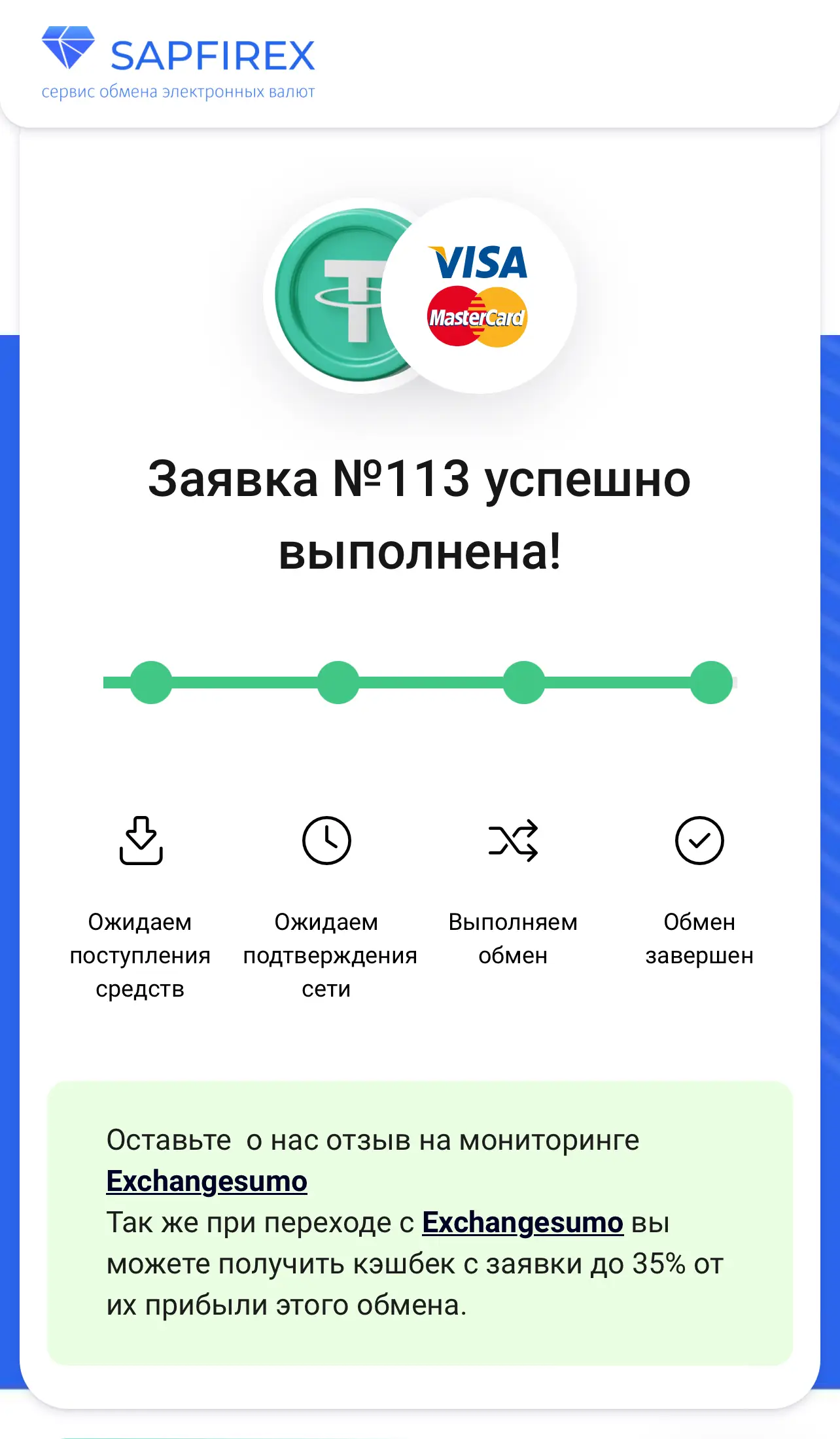 Вы можете оставить свой отзыв, если имеете опыт взаимодействия с обменником Sapfirex. Не забудьте похвалить обменник, если обмен прошел успешно. Если у вас есть жалобы на работу sapfirex.com, вы можете в отзывах высказать все свои претензии.